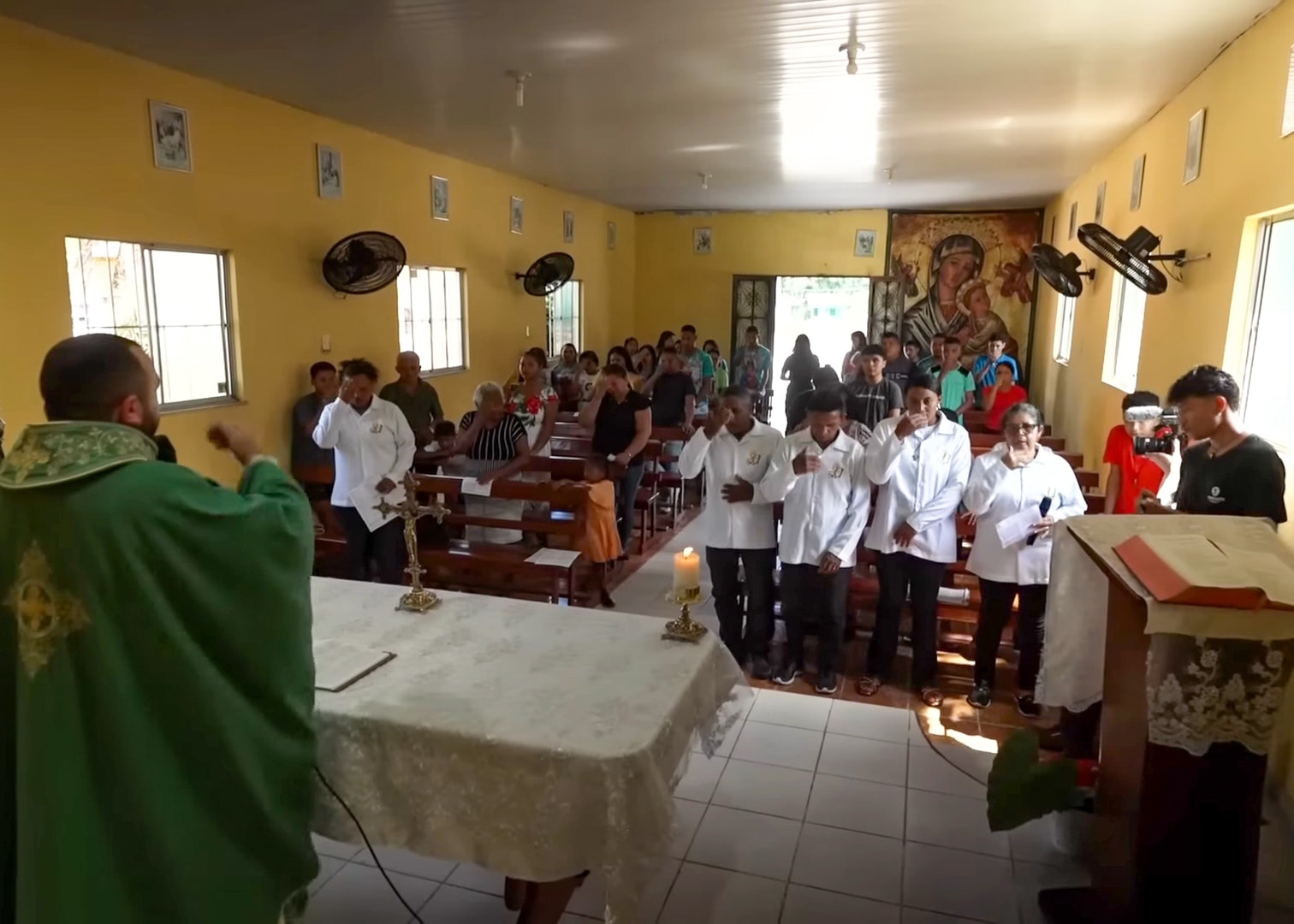 O documentário também mostra a diversidade religiosa amazônica, onde diferentes expressões de fé convivem lado a lado. Ainda assim, a tradição católica permanece como alicerce espiritual para muitas famílias, especialmente pela presença sacramental, pelas festas dos padroeiros e pela devoção popular, que traduz a fé em alegria, canto e partilha.