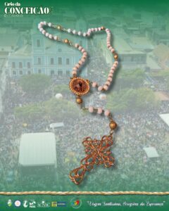 O Terço foi ofertado pela Família Aracati e Carneiro, em memória de Marta Carneiro da Silva, cujo testemunho de fé e devoção permanece vivo e inspira esta entrega solene. Produzido em São Paulo, o terço tem as contas das Ave-Marias em cristais de opalina branca e nas contas maiores do Pai-nosso esferas douradas. Uma cruz em estilo de filigrana cravejada de cristais e, unindo ao centro na “Salve Rainha”, um camafeu com vinte e oito micro opalinas que ladeiam a imagem da Imaculada Conceição.