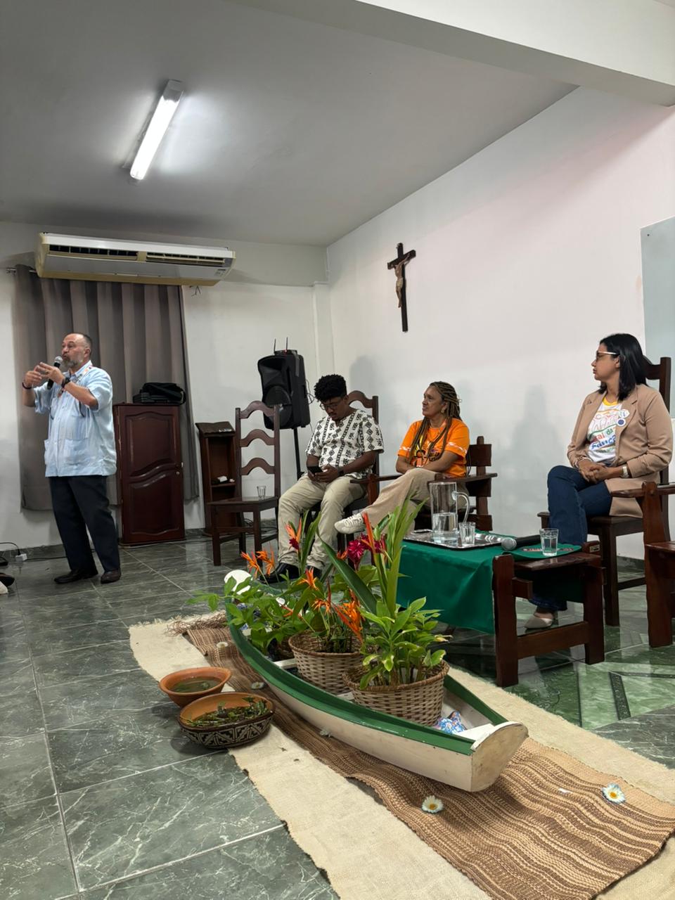 O primeiro dia (9/11) do Circuito Pan-Amazônico de Saberes e Sabores da Amazônia, promovido pela REPAM-Brasil, estabeleceu o tom do engajamento: um dia focado na escuta das dores e esperanças da região. O evento, realizado na sede do Regional Norte 2 da Conferência Nacional dos Bispos do Brasil – CNBBN2, funcionou como um espaço de integração em torno da Casa Comum e da economia solidária. Um dos destaques foi a Feira do Bem-Viver, que expôs produtos da agricultura familiar e artesanato de diversos biomas, incluindo biojoias, ervas medicinais e alimentos agroecológicos, celebrando a diversidade produtiva da Amazônia e do Brasil. A programação também incluiu a exibição de um documentário da REPAM-Colômbia sobre a gestão comunitária da água, reforçando a importância vital deste recurso para a vida e os direitos das populações locais.