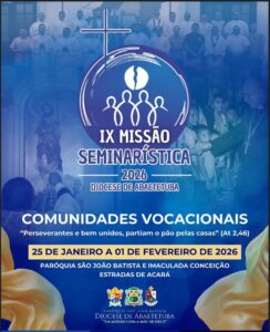 A Diocese de Abaetetuba realizará, entre os dias 25 de janeiro e 01 de fevereiro de 2026, a ‘IX Missão Seminarística’, que neste ano traz como tema “Comunidades Vocacionais”, inspirada no versículo dos Atos dos Apóstolos: “Perseverantes e bem unidos, partiam o pão pelas casas” (At 2,46).