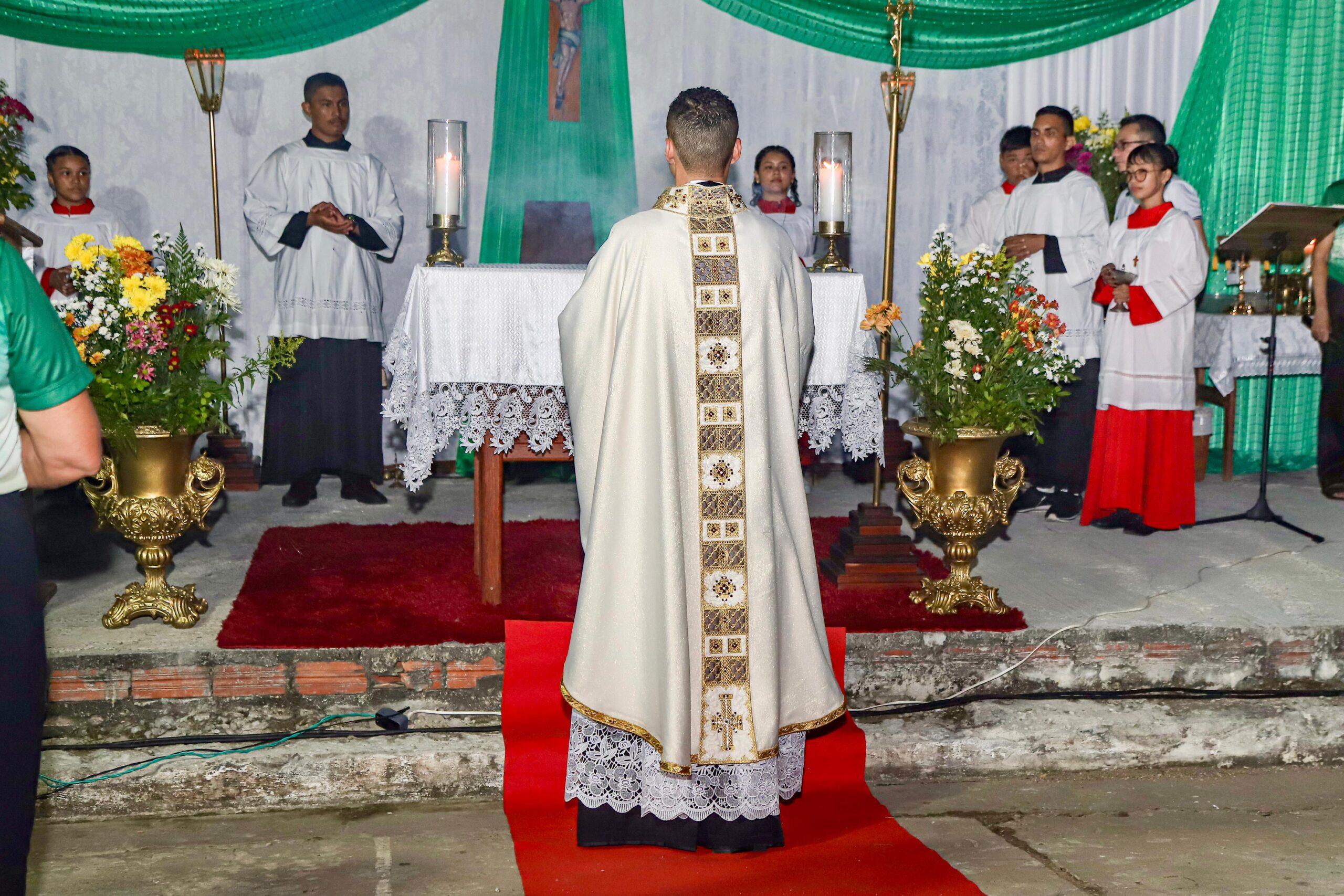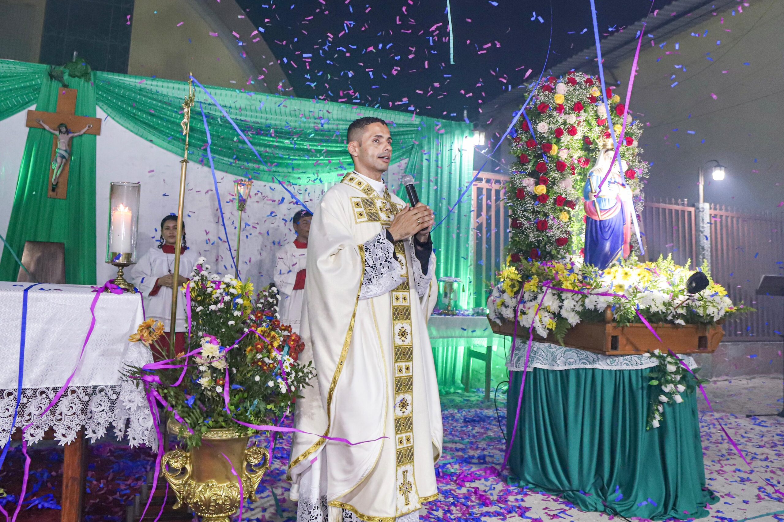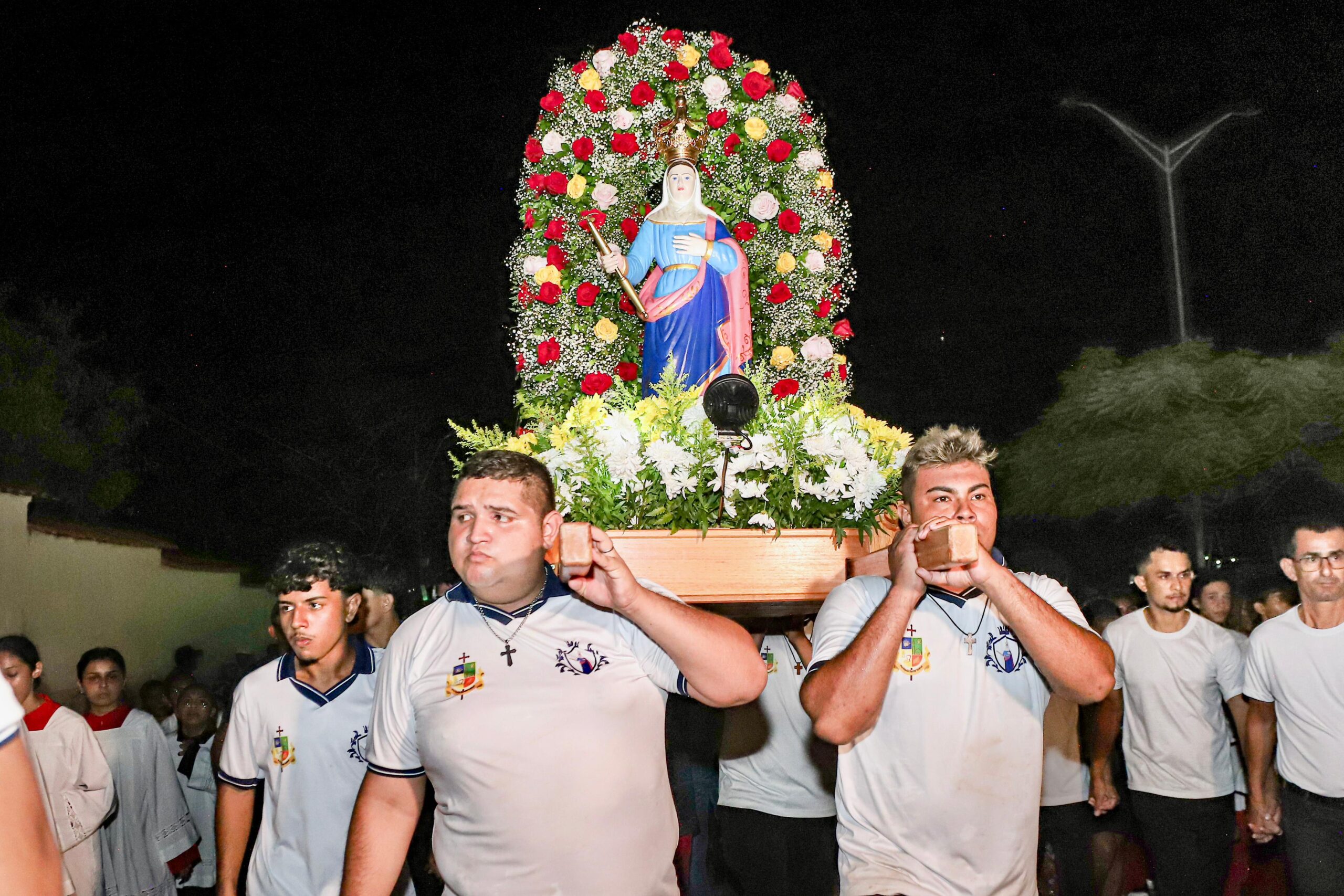 Do porto, os fiéis seguiram em procissão até as portas da Igreja Matriz, onde os sinos anunciaram o início da Santa Missa presidida pelo pároco padre Rodrigo Allan “Foi uma noite onde o céu parecia mais perto, e a graça descia como brisa sobre os rostos emocionados. Cada canto, cada prece, cada olhar reverente era semente de amor plantada no coração de Terra Santa. Na procissão, os fiéis seguiram em procissão, como quem caminha levado pela mão da própria santa”, disse padre Rodrigo.