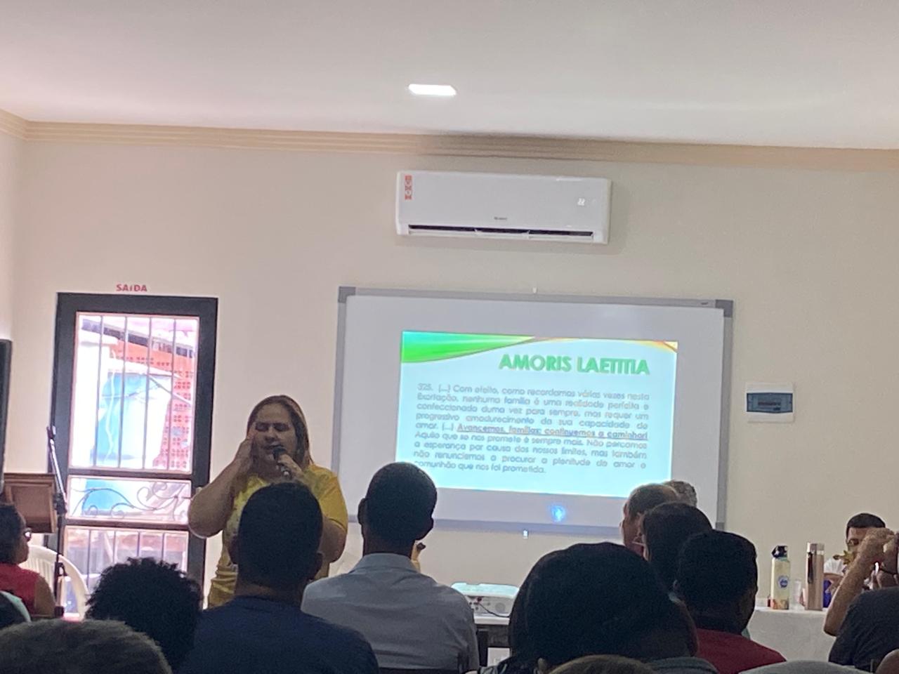 O casal coordenador da Pastoral Familiar do Regional Norte 2, Luciana e Carvalho, apresentaram a ‘Estrutura e Visão Global da Pastoral Familiar’ onde dividiram a estrutura em três partes, a preparação remota, a prepaaração proxima e a preparação imediata. Na preparação remota é trabalhado, ao longo prazo, a preparação das crianças e jovens que se encontram no seio da família, no exemplo que os filhos recebem dos pais; nas Escolas; na Catequese – 1ª. Eucaristia; na Catequese – Crisma; nos Grupos de jovens e no tempo do namoro.