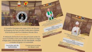 O Conselho Diocesano de Leigos (CDL) da Diocese de Bragança do Pará encerra amanhã, dia 12 de fevereiro, as inscrições para a ‘Edição 2026 da Escola de Fé e Cidadania Nonato Silva’. A formação acontecerá durante um final de semana, mensalmente, de fevereiro a julho, iniciando nos proximos dias 14 e 15. Esta iniciativa é uma das ações centrais do Conselho, e visa a formação aprofundada dos leigos e leigas para o pleno exercício de sua identidade, vocação e missão, tanto dentro da Igreja quanto na sociedade em geral.