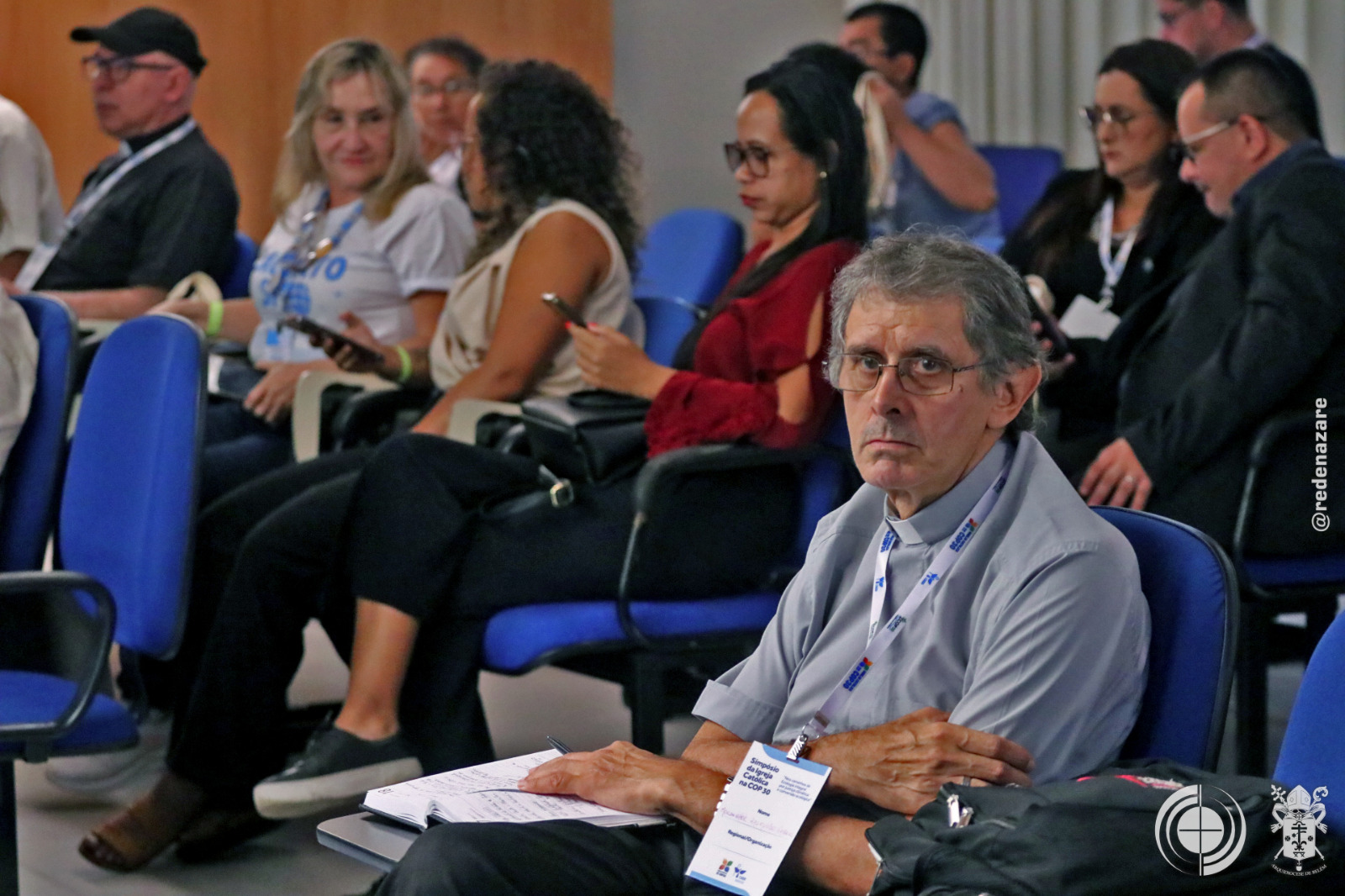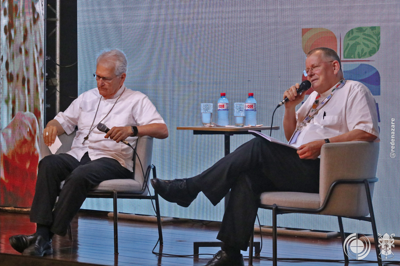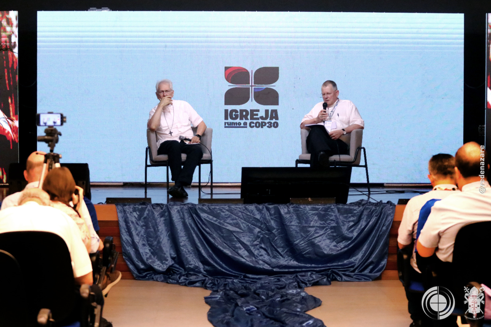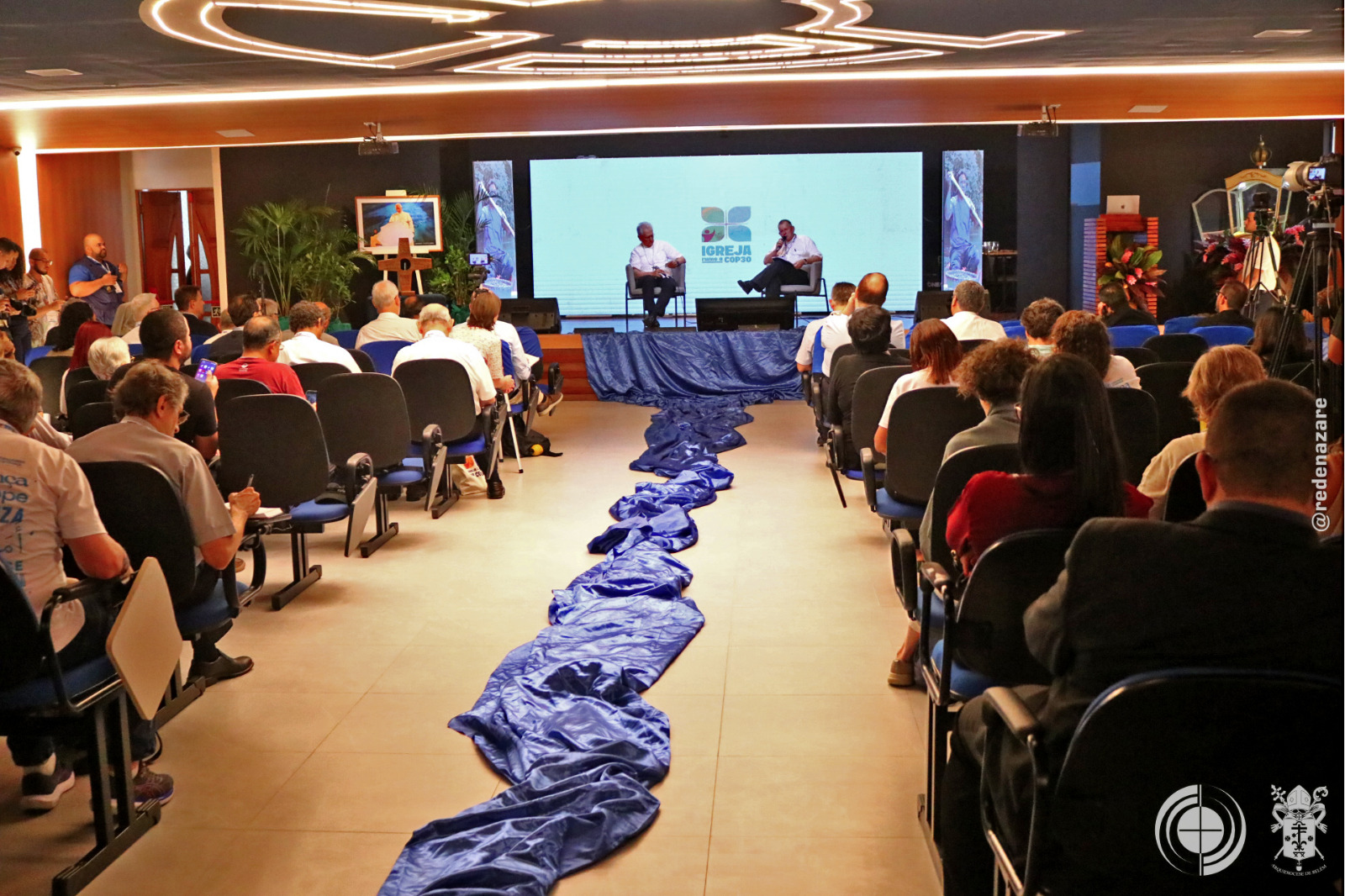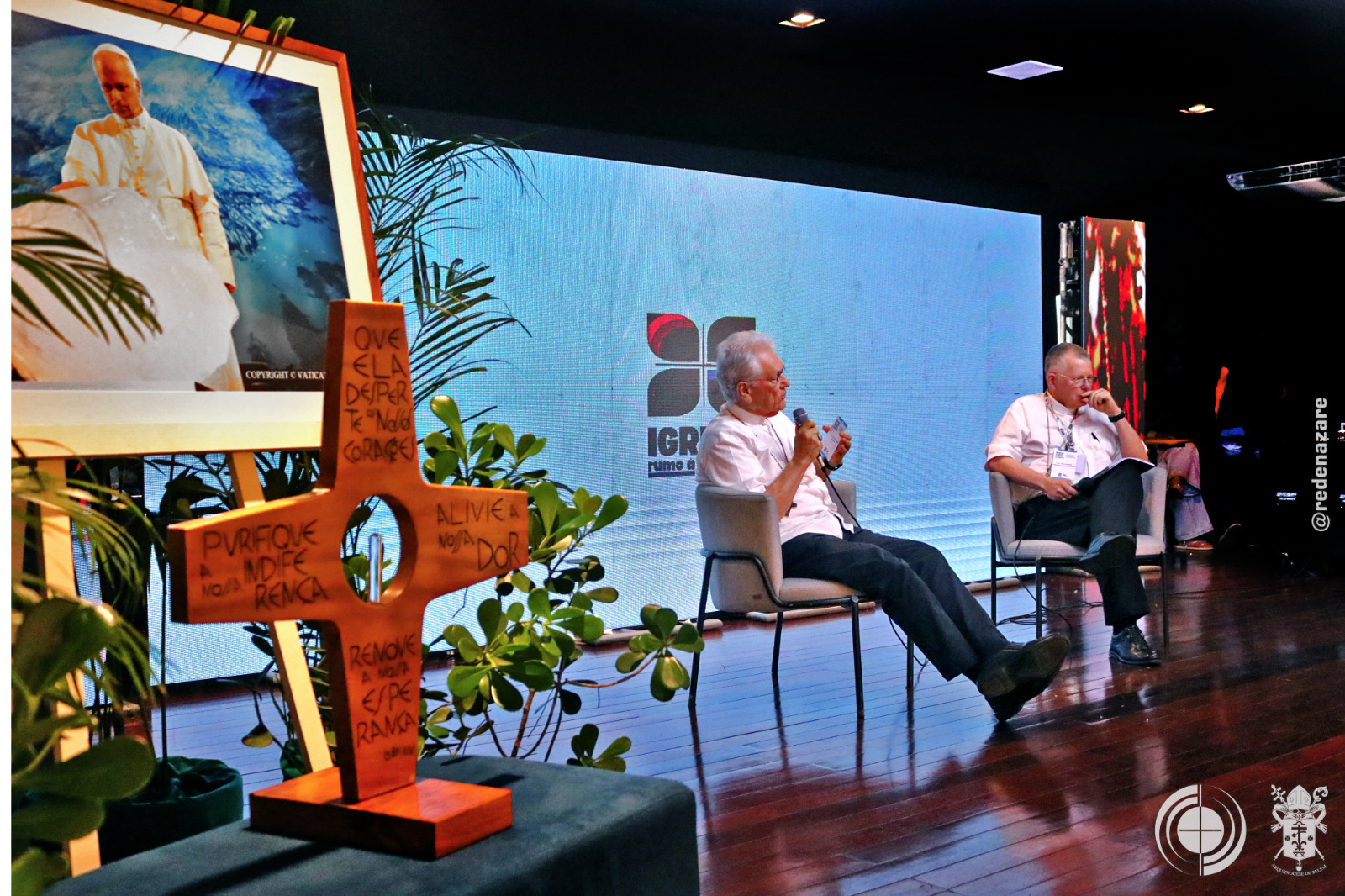 O simpósio não foi apenas um debate, mas um ato litúrgico e profético que era percebido não apenas nas explanações, mas na composição de todo o ambiente. No centro do palco, um tecido chamado “Rio da Esperança”, trazido pelo movimento Laudato Sí, de Roma. O tapete, simbolizou a unidade e a responsabilidade compartilhada sobre as águas. Ao lado, um ícone de madeira em formato de cruz continha água derretida de um bloco de gelo da Groenlândia, abençoada pelo Papa Francisco. A peça peregrinou por santuários brasileiros até a COP30. Estes objetos materializam a crise e a fé que move a ação.