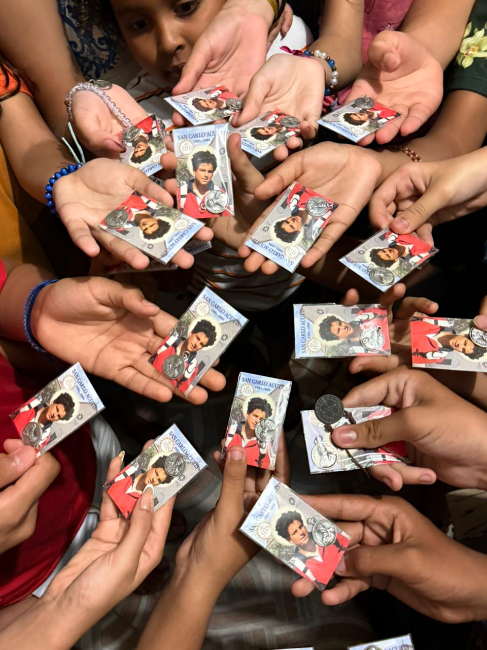 Os pequenos devotos foram surpreendidos quando receberam a oração e a medalha de São Carlo Acutis, trazidas de Assis (Itália) pelos catequistas que participaram do Jubileu dos Catequistas em Roma.