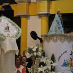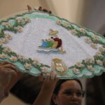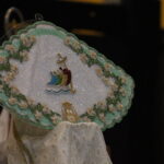 O manto, além de sua imponência, é fechado por um broche que revela a glória celestial. Nele, Nossa Senhora segura o Menino Jesus nos braços, cercada por anjos, destacando sua centralidade e proteção sobre todos.