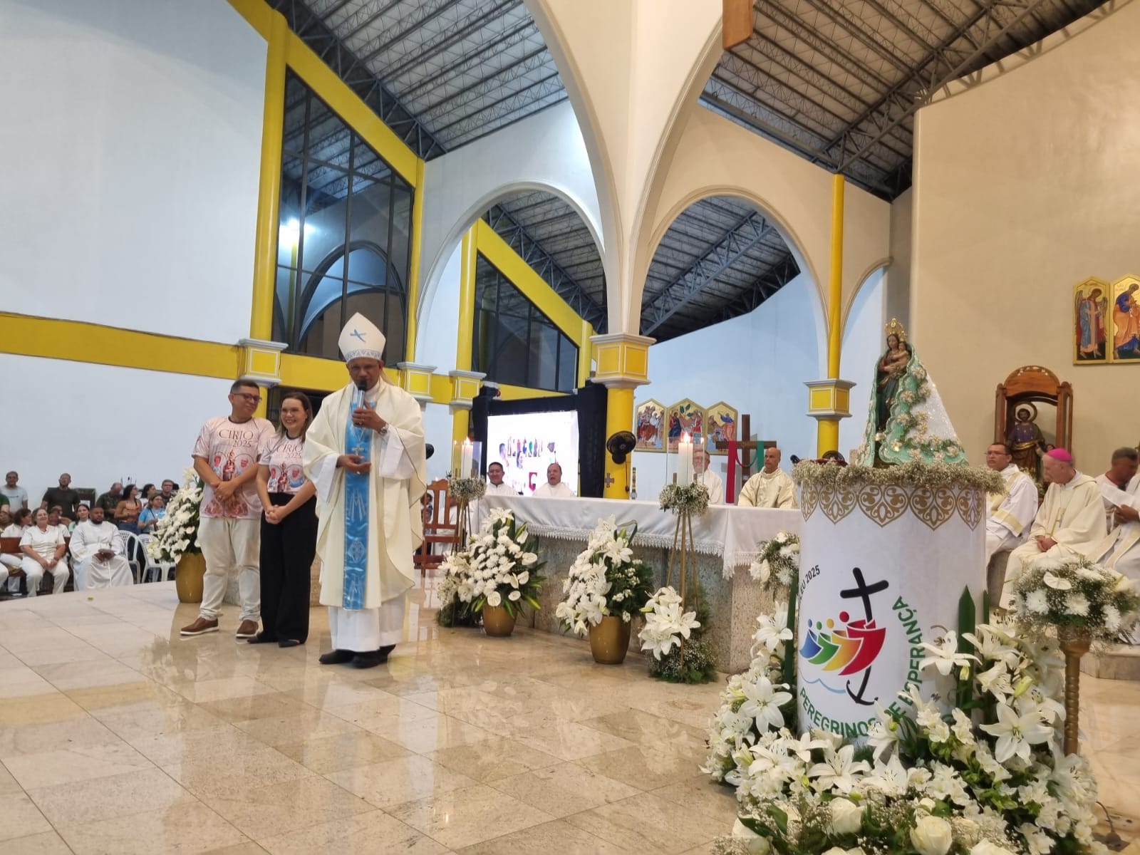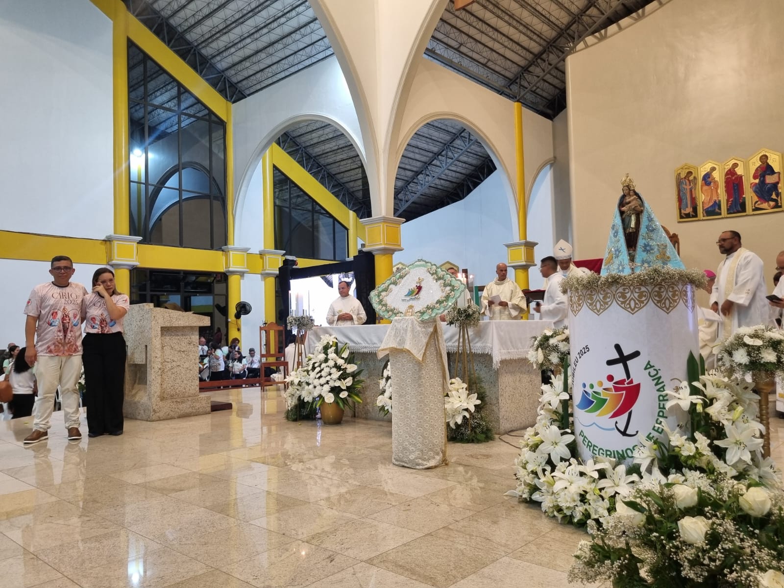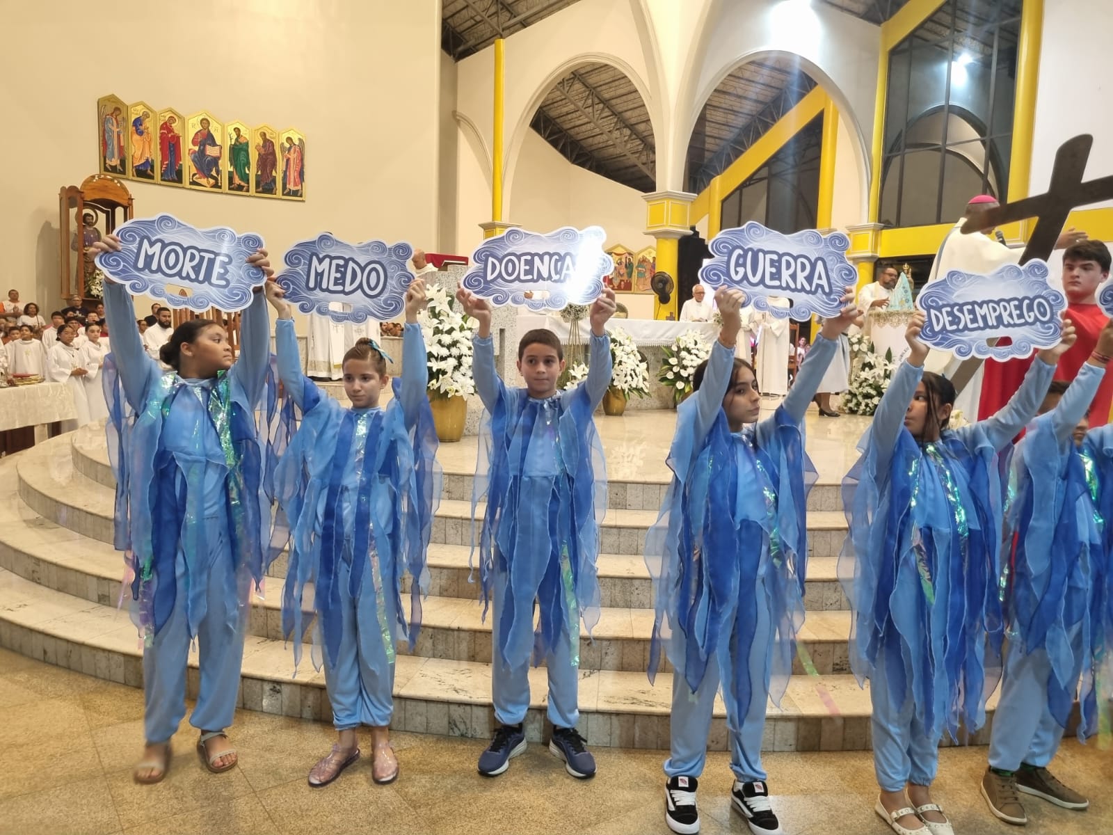 Crianças em homenagem ao Ano Jubilar fizeram o cortejo da entrada da imagem de Nossa Senhora de Nazaré onde levavam com elas as palavras Fé, Esperança e Amor e o símbolo do ‘Jubileu da Esperança’ representado por crianças caracterizadas com as vestimentas coloridas dos peregrinos carregando a cruz da esperança, observada na logo do jubileu.