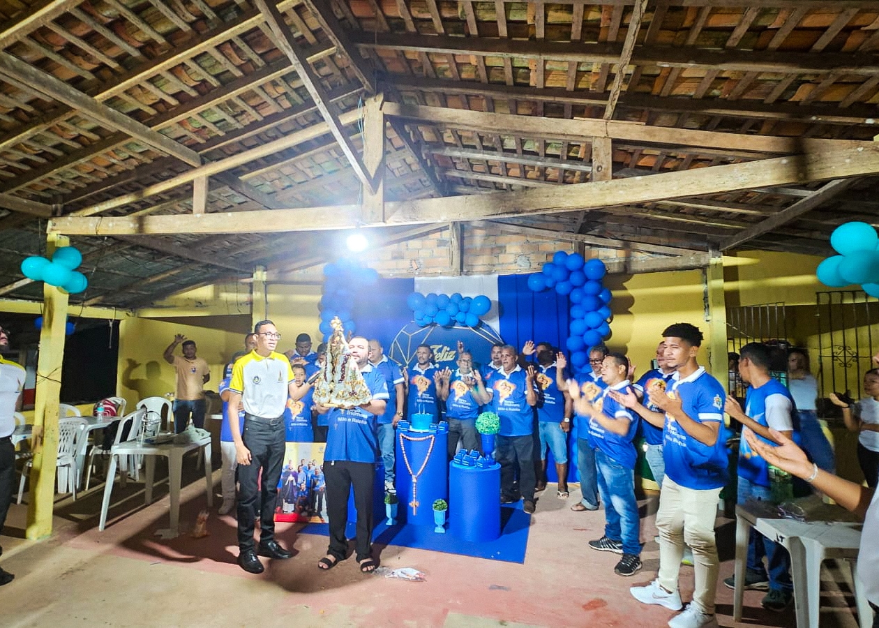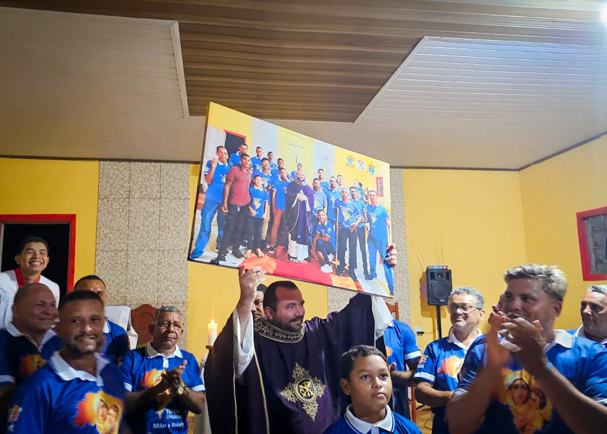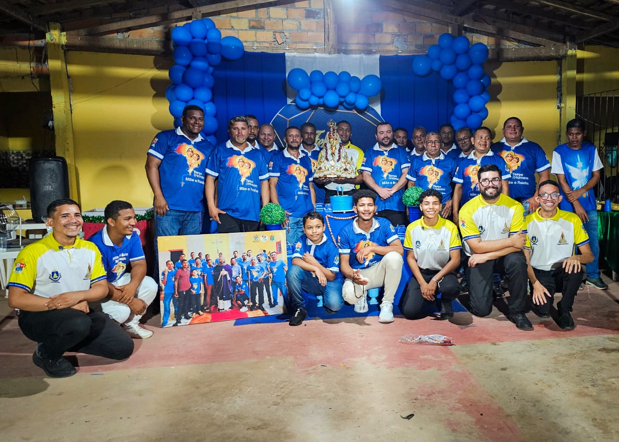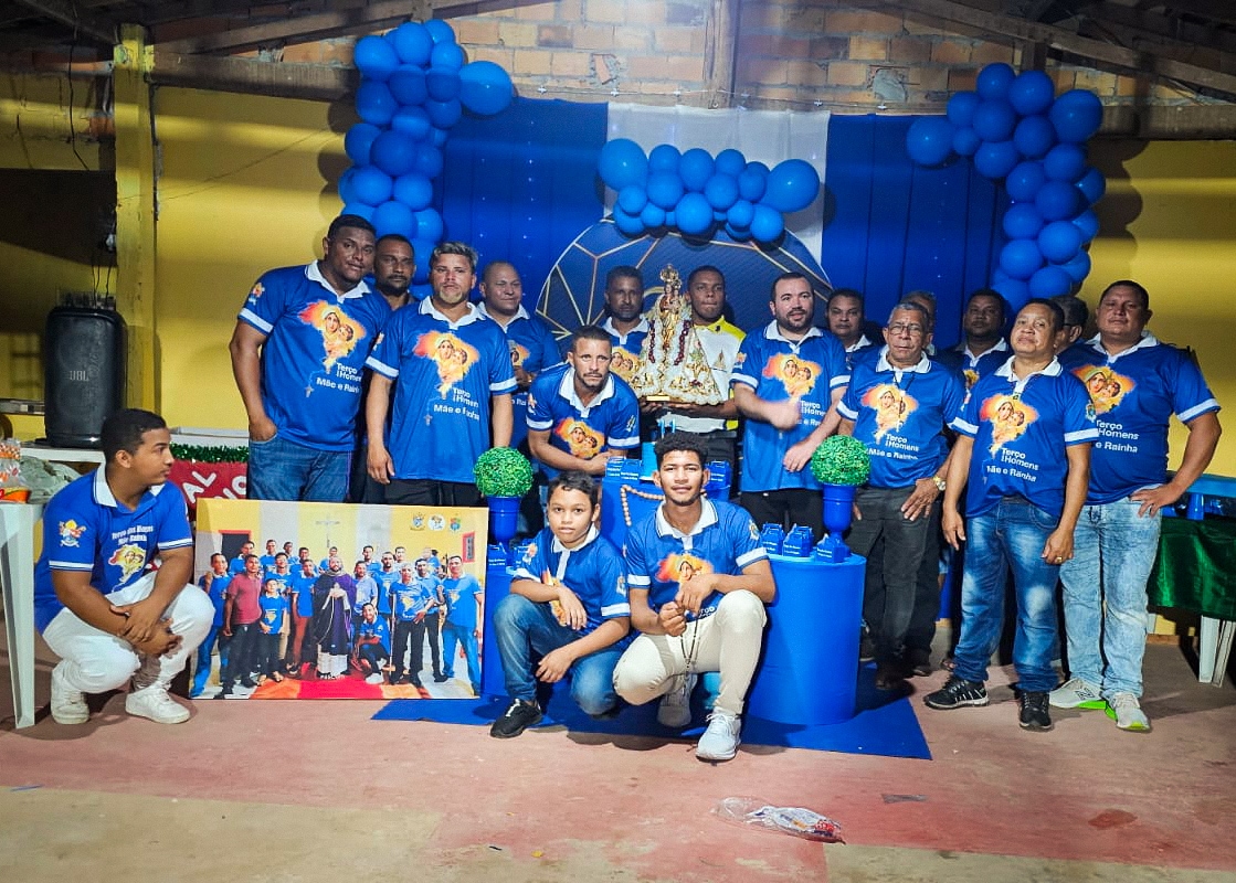 A programação festiva foi centrada na Santa Missa, presidida pelo pároco, padre Francisco Messias. A celebração ganhou contornos ainda mais especiais com a apresentação de duas crianças e a emocionante acolhida da imagem peregrina de Nossa Senhora de Nazaré, trazida pelos seus guardas da Paróquia São Francisco Xavier – Barcarena. O momento culminou com a bênção das novas camisas do Terço dos Homens, um símbolo visível do renovado empenho com a oração e o serviço à Igreja.