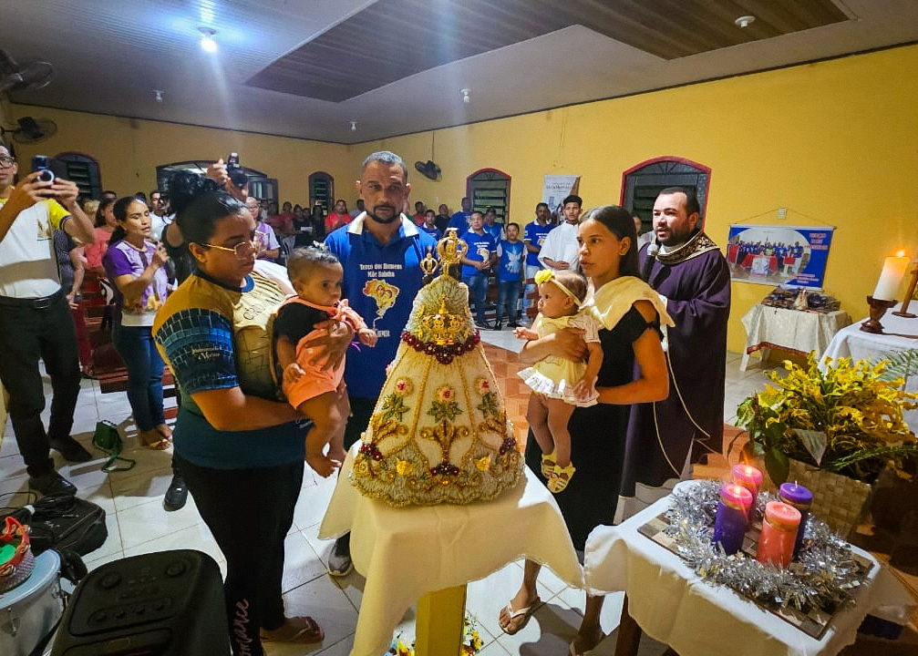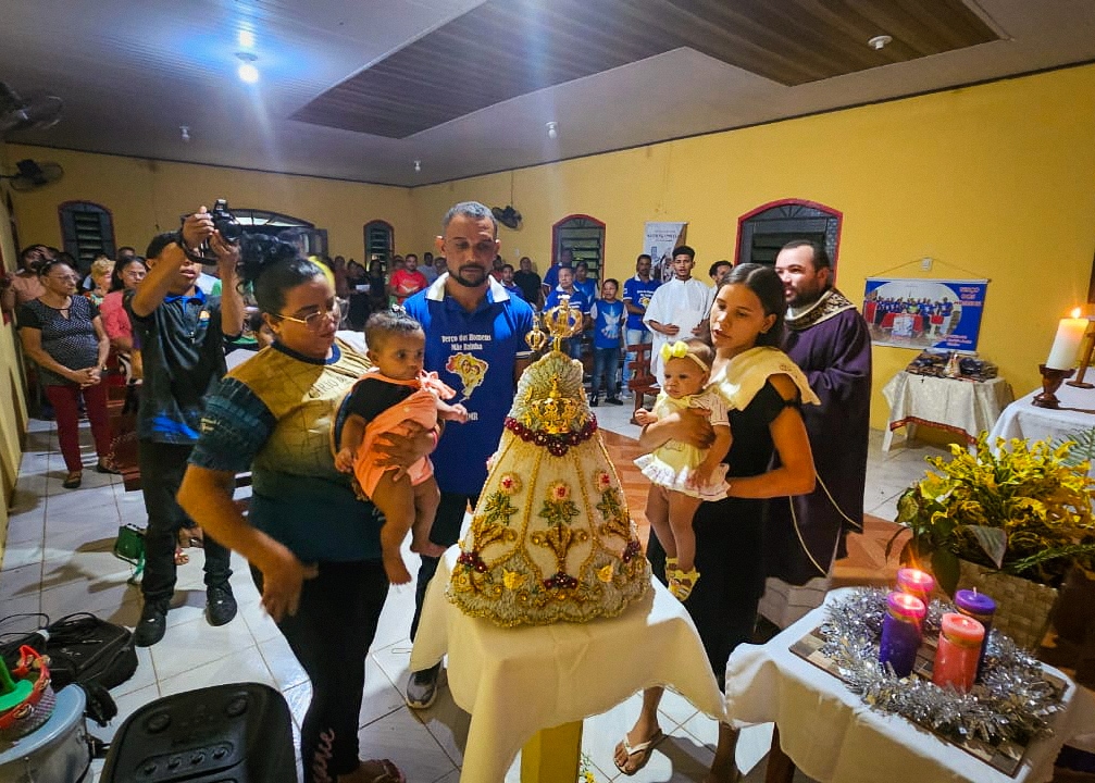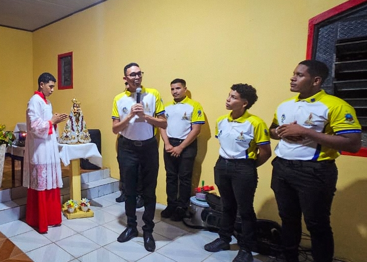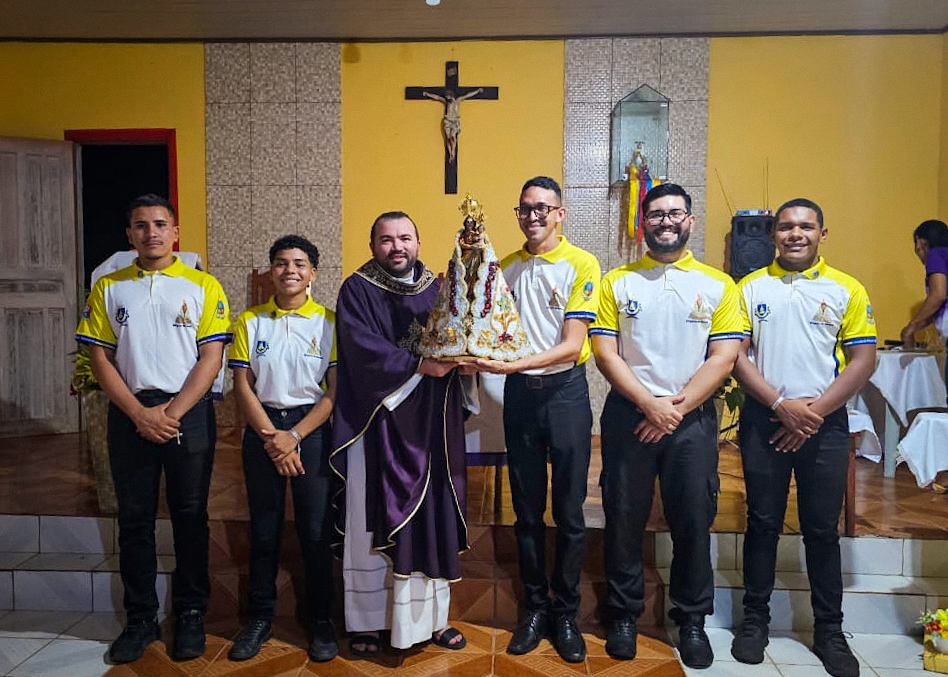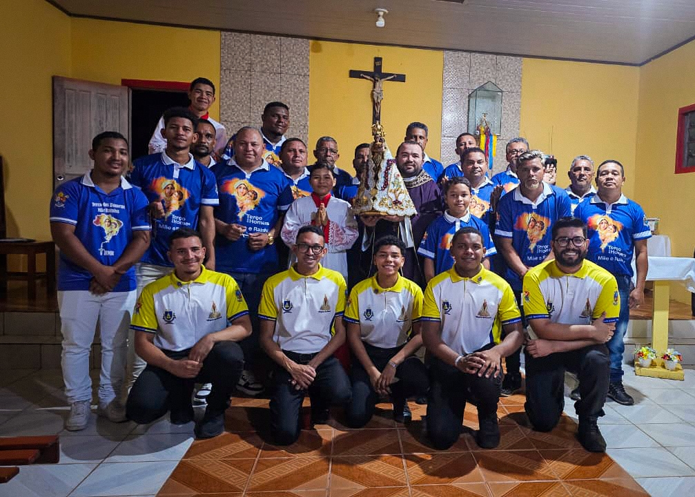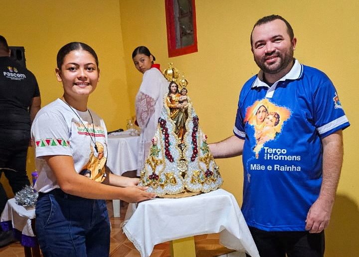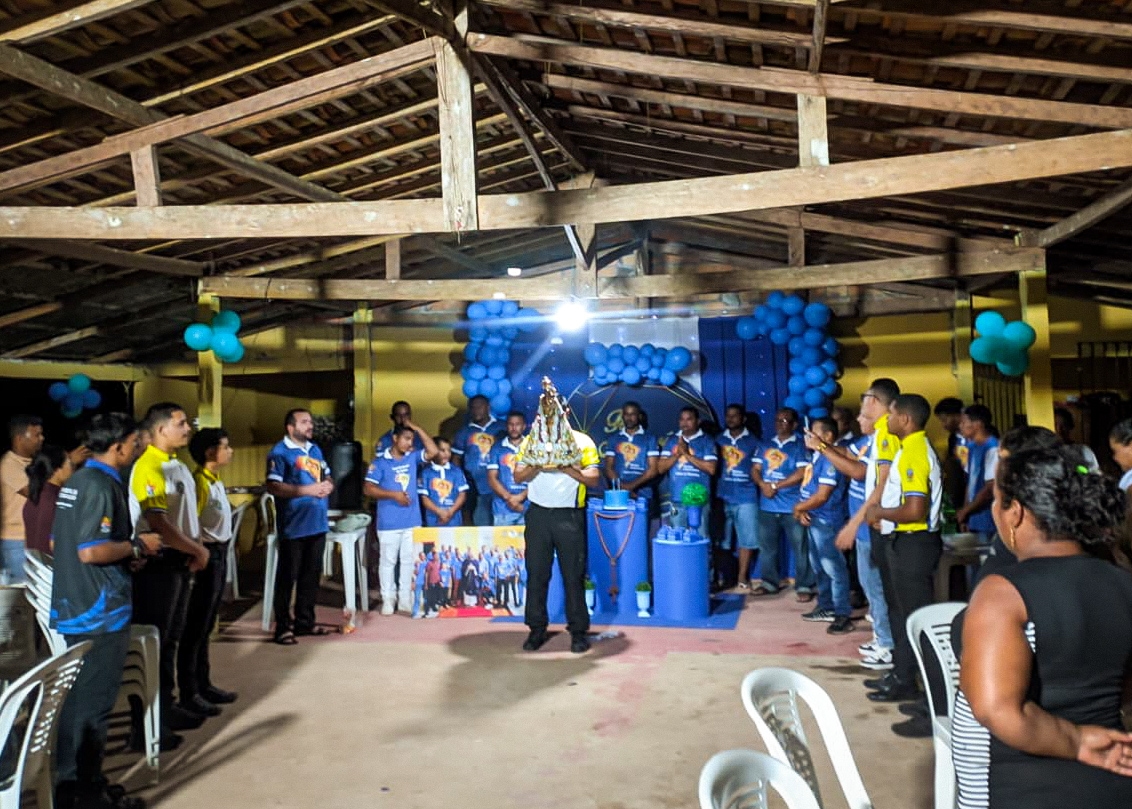 A programação festiva foi centrada na Santa Missa, presidida pelo pároco, padre Francisco Messias. A celebração ganhou contornos ainda mais especiais com a apresentação de duas crianças e a emocionante acolhida da imagem peregrina de Nossa Senhora de Nazaré, trazida pelos seus guardas da Paróquia São Francisco Xavier – Barcarena. O momento culminou com a bênção das novas camisas do Terço dos Homens, um símbolo visível do renovado empenho com a oração e o serviço à Igreja.