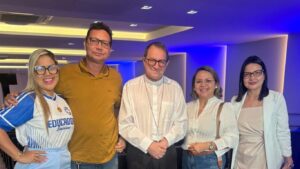 A Pastoral da Educação do Regional Norte 2 marcou presença com uma comitiva expressiva, reafirmando seu compromisso com uma educação que seja, ao mesmo tempo, evangelizadora, humanizadora e alinhada aos princípios do Pacto Educativo Global. Entre os presentes estavam Dom Vital Corbellini, bispo referencial para a Educação do Regional e bispo da Diocese de Marabá; a professora Lady Anne Souza, coordenadora Regional da Pastoral da Educação; a professora Thaís Lins, assessora Regional para o Ensino Religioso; e os professores colaboradores Kléber Pinheiro, Marília Lopes e Adriana Saldanha, coordenadora da Pastoral da Educação da Diocese de Macapá.