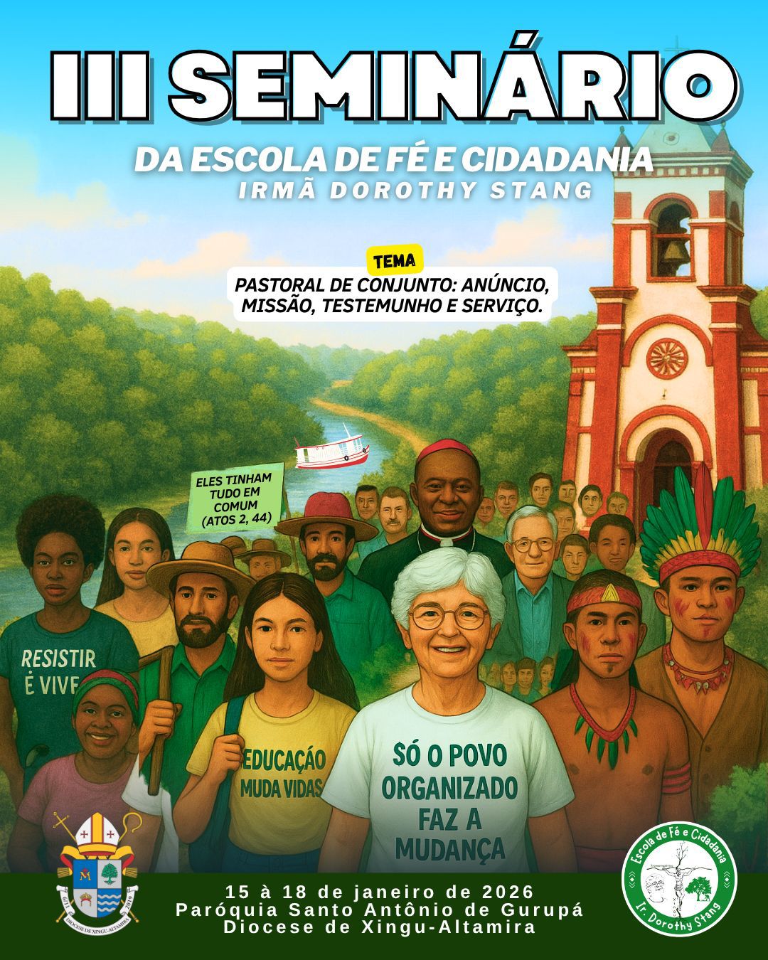 Entre os dias 15 e 18 de janeiro de 2026, a Diocese de Xingu Altamira, no Pará, foi palco do ‘III Seminário Diocesano da Escola de Fé e Cidadania Irmã Dorothy Stang’. Realizado em Gurupá, o encontro reuniu cerca de 290 participantes, consolidando-se como um marco na formação de leigos e leigas engajados na realidade local. O evento celebrou os 11 anos da Escola, que carrega o legado de resistência e serviço da Irmã Dorothy Stang, assassinada em 2005. O tema central, “Pastoral de Conjunto: anúncio, missão, testemunho e serviço”, orientou as discussões, visando o protagonismo dos agentes pastorais à luz da Doutrina Social da Igreja e em sintonia com as deliberações da I Assembleia do Povo de Deus da Diocese.