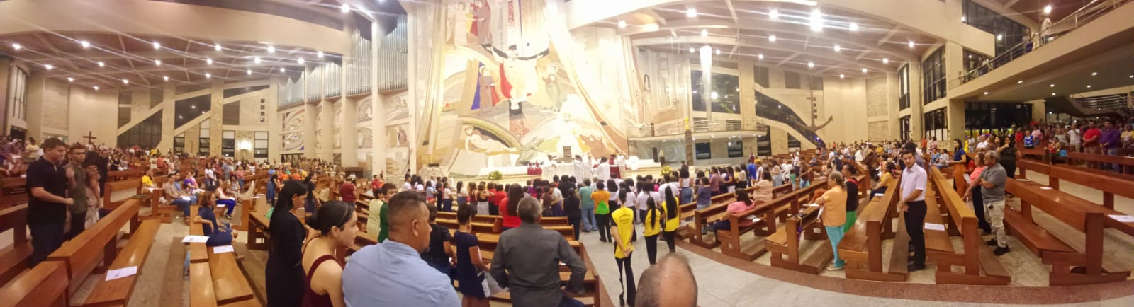 O canto de entrada, Imaculada Maria do Povo, abriu a celebração, que as vozes cantantes do ministério de música mirim, Amiguinhos pela Fé, da Paróquia São João Paulo II, fizeram dessa noite uma das mais belas da programação da Romaria.